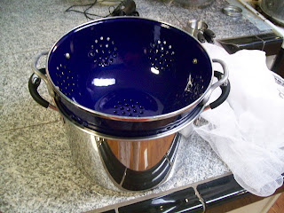 Usually by the time you get your colanders ready to go it's time to ladle the slurie in! Just put a little at a time in until its full. Usually, I like to have 2 or 3 bowls with colanders ready to go. Most of the time one won't hold it all. So when one fills, just move on to the next one.